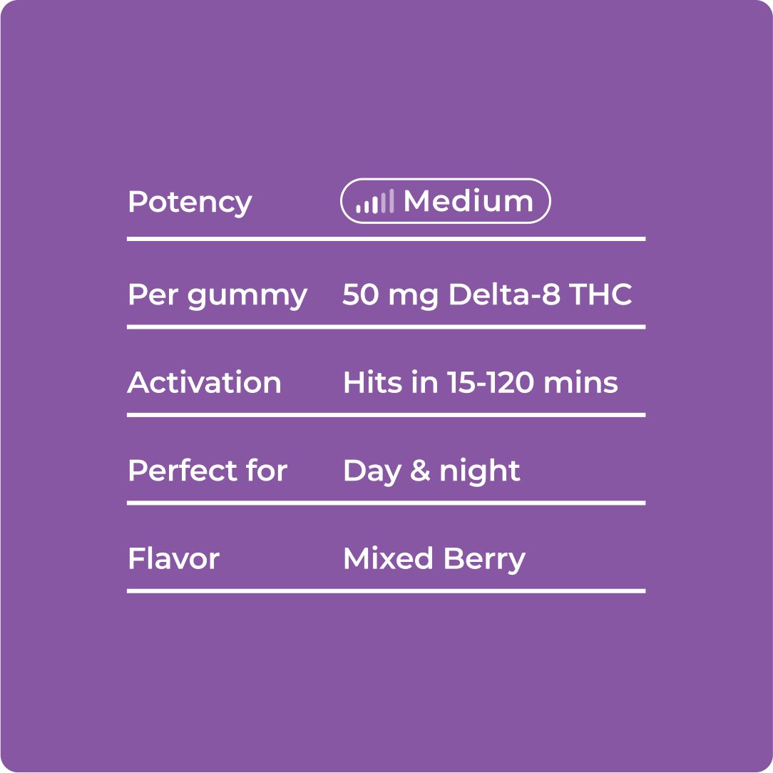 Delta 8 THC, like any other cannabinoid, can have potential side effects. However, it is generally well-tolerated when consumed in moderate amounts. The possible side effects of Mixed Berry Beach Delta 8 Gummies may include dry mouth, appetite changes, and tiredness. It is crucial for you to know that such side effects are often mild and temporary. They are often part of the body's initial adjustment to the cannabinoid and usually subside as the body adapts over time.