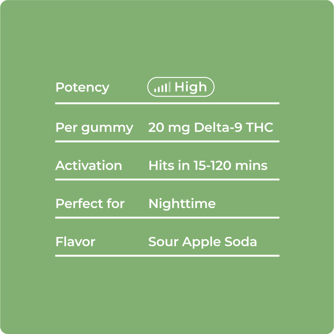 Sour Apple Soda Shop Dispensary Grade Delta 9 THC Gummies are highly potent and perfect for consumers who appreciate a powerful cannabis experience. Every gummy in the package delivers a generous 20mg of Delta 9 THC, resulting in an overall strength of 200mg for each 10-piece pack. These potency levels are relatively high in the cannabis edibles market, highlighting the robust psychoactive experience you can anticipate when consuming these gummies. But potency isn't one-size-fits-all. Some users might prefer this potency level, while others—especially beginners or those with a lower tolerance to THC—might find it overwhelming. So, we recommend starting with a smaller dose, perhaps half a gummy, and gradually increasing if required. Before embarking on a new cannabis product journey, consulting a healthcare professional is always advisable to ensure a safe and enjoyable experience.